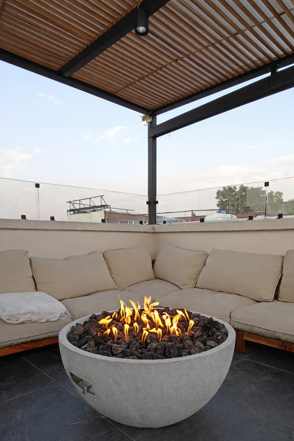 Bowl fabricado en concreto reforzado con fibra de vidrio de 122 cm, cuenta con un quemador de gas, incluye tapa de madera de huanacaxtle. Ideal para exteriores. Con opción a elegir con quemador a gas o bioetanol.